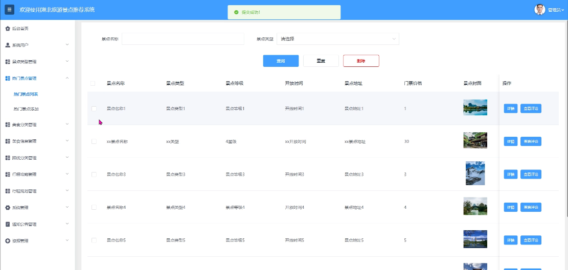 - 热门景点管理:管理员可管理所有热门景点的发布、下架、更新等操作,提供搜索功能,支持查看和管控其评论内容。