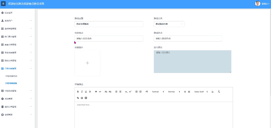- 行程规划管理:管理员可管理所有行程规划信息,包括新增、编辑、删除和查询行程规划。
