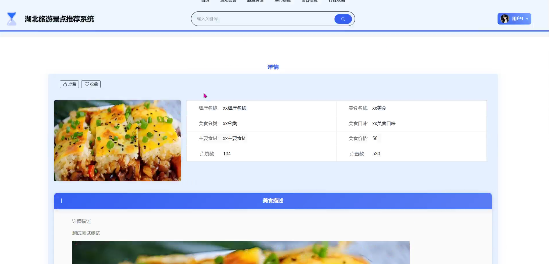 - 首页:提供系统搜索功能和系统功能导航栏,展示平台的轮播图、最新旅游动态、热门景点推荐信息(采用协同过滤算法,根据用户点击的景点类型优先推荐同类型信息)、美食信息推荐(根据用户收藏的美食类型优先推荐)等内容。