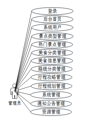湖北旅游景点推荐系统中管理员则集成了登录、后台首页、系统用户、景点类型管理、热门景点管理、美食分类管理、美食信息管理、路线分类管理、行程攻略管理、行程规划管理、系统管理、通知公告管理、资源管理等功能。管理员用例图如下所示: