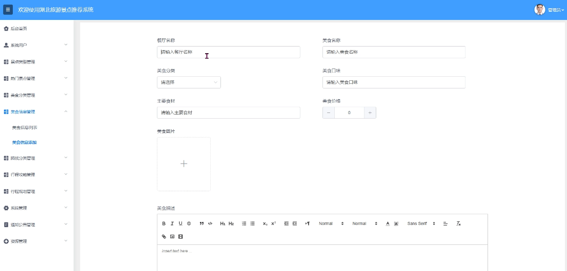 管理员可管理所有美食信息的发布、下架、更新等操作,提供搜索功能,支持查看和管控其评论内容。界面如下图所示。
