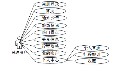 在湖北旅游景点推荐系统中普通用户包含注册登录、首页、通知公告、旅游资讯、热门景点、美食信息、行程攻略、我的账户、个人中心等功能。普通用户用例图如下所示: