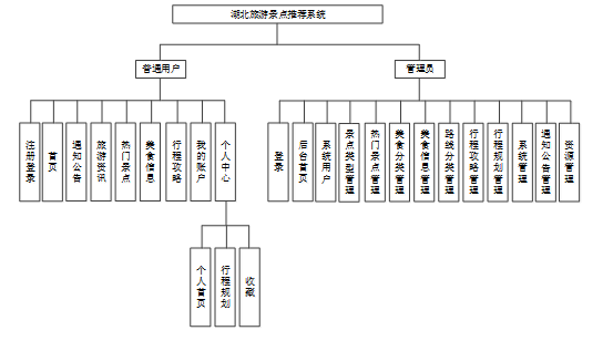 本湖北旅游景点推荐系统根据使用者划分,主要包含普通用户和管理员两大角色,每个角色对应的主要功能说明如下所示: