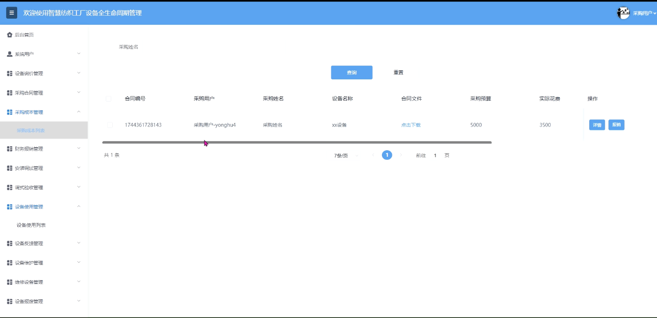- 采购成本管理:在采购成本管理模块,用户可以查看采购成本列表,并进行查询、重置和查看详情的操作,以确保采购成本的透明和合理。