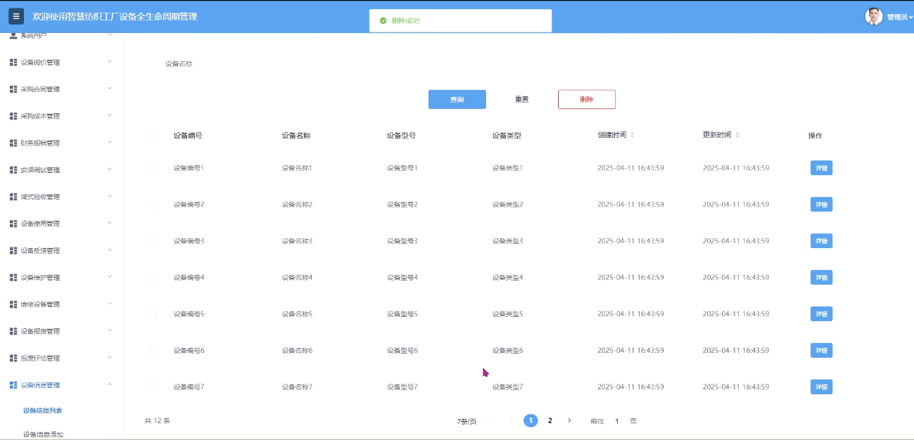 - 设备信息管理:设备信息列表可以查看,用户可以进行查询、重置、删除和详情的查看,以及设备信息添加,全面掌握设备信息。