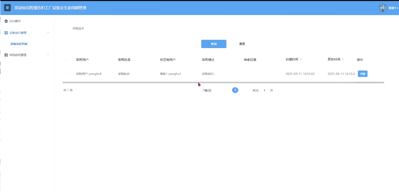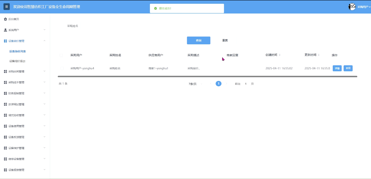 The Smart Textile Factory Equipment Lifecycle Management System based on SpringBoot provides a comprehensive and efficient solution for equipment management in the textile industry. The system covers the entire process from procurement, installation and commissioning, Through an integrated platform, different roles such as operators, equipment technicians, financial users, and suppliers can collaborate efficiently, achieving information sharing and process optimization. For instance, equipment technicians can update installation and maintenance records in real-time, while financial users can quickly process procurement costs and financial reimbursement matters.