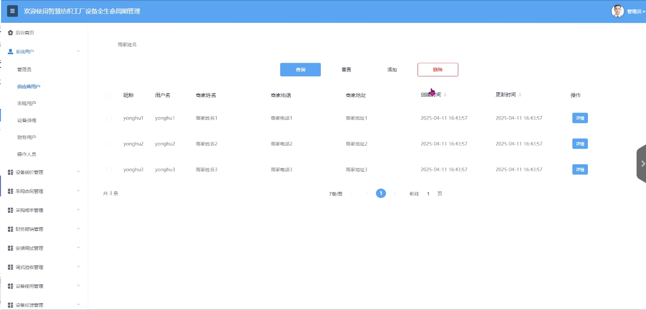 - 系统用户:系统中包含了多种类型的用户角色,包括供应商用户、采购用户、设备师傅、财务用户、操作人员等。每种用户都可以进行查询、重置和查看详情的操作,以满足不同角色的管理需求。