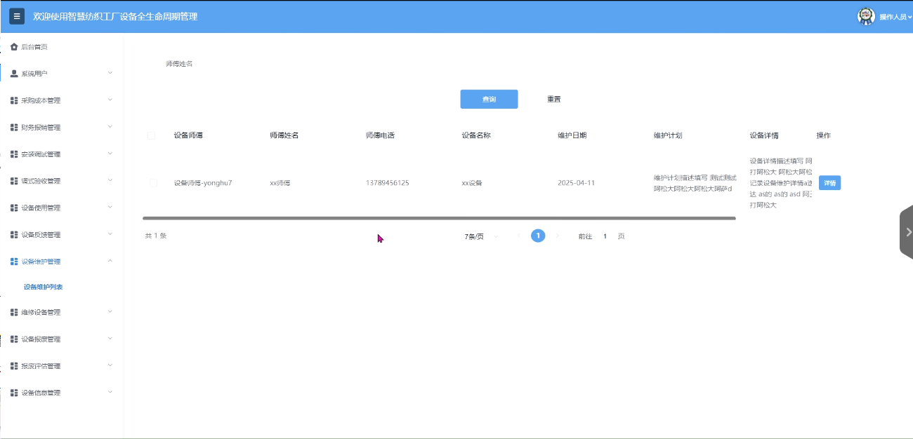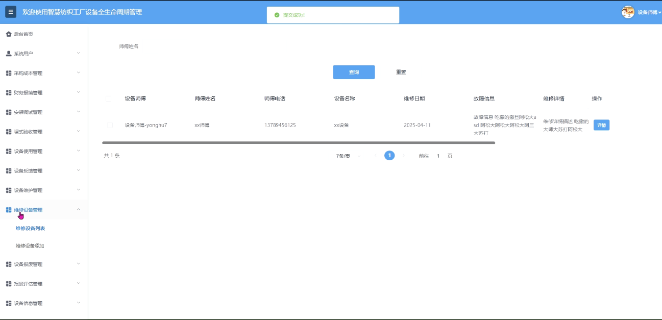 - 设备维护管理:设备维护列表可以查看,用户可以进行查询、重置和详情的查看,以及设备维护添加,确保设备的长期稳定运行。