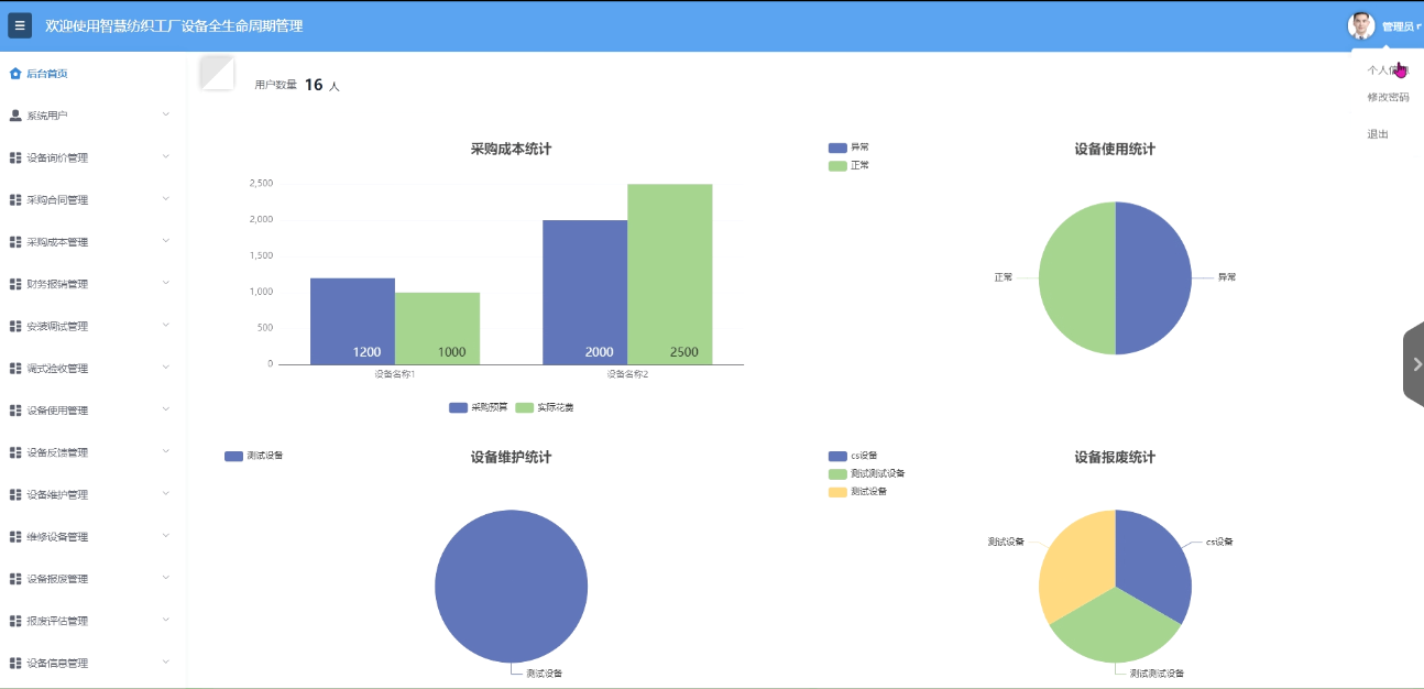 在后台首页,管理员可以直观地看到采购成本、设备使用、设备维护以及设备报废的统计图。此外,点击个人头像可以查看或修改个人信息和密码。模块如下图所示。