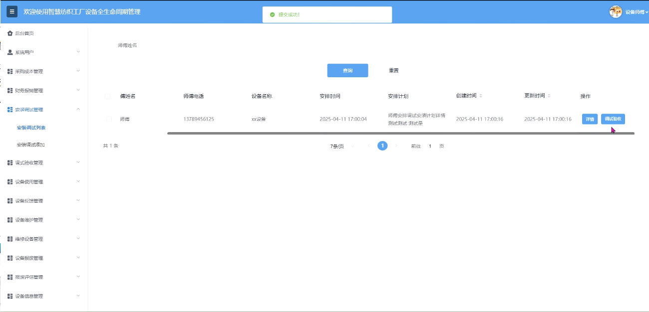 - 调试验收管理:调试验收列表可以查看,用户可以进行查询、重置和详情的查看,确保设备调试验收的质量。
