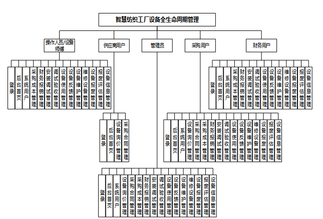 系统中包含多种用户角色,包括管理员、供应商用户、采购用户、设备师傅、财务用户、操作人员等。每种角色都可以进行查询、重置、删除、添加和详情查看的操作。所有用户均由管理员负责添加和登录管理。流程图如下所示。