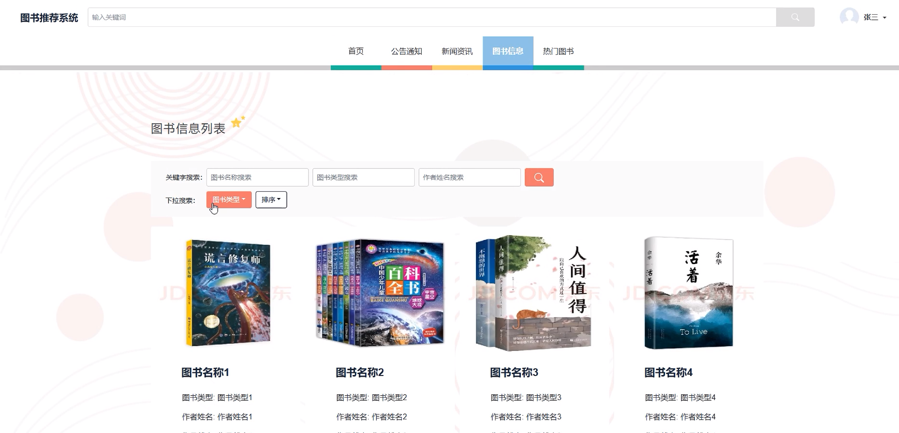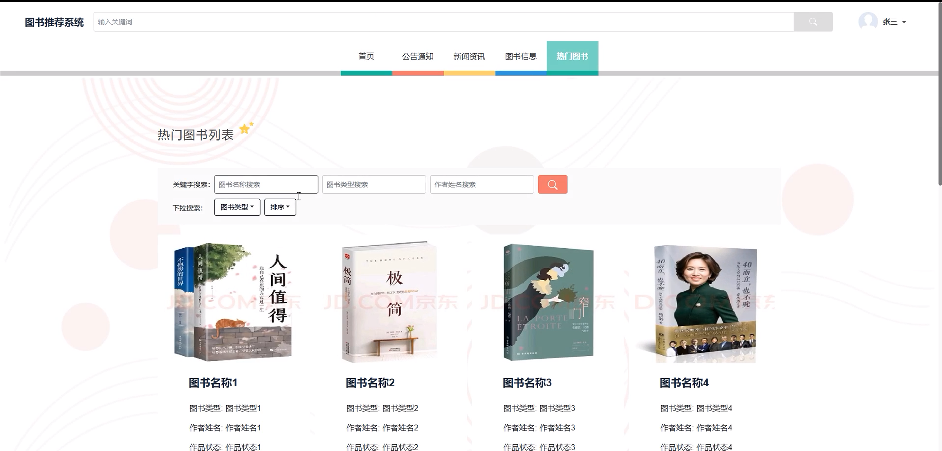 (2)首页:首页展示轮播图、公告通知、新闻资讯、图书信息、热门图书等功能导航栏。