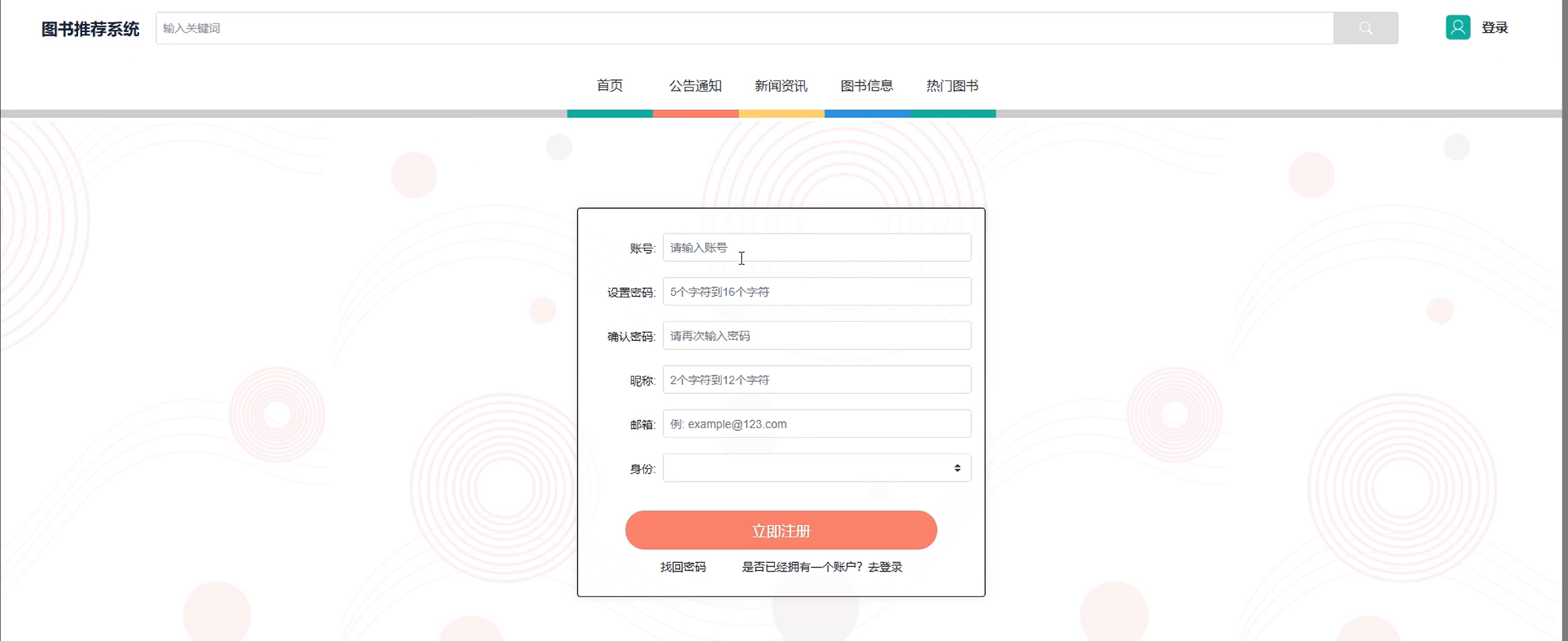 (1)注册登录:在图书推荐系统中,用户可通过简洁的界面完成注册与登录操作。注册时,用户填写基本信息并提交即可创建账户;登录时,输入用户名和密码后即可快速进入平台。