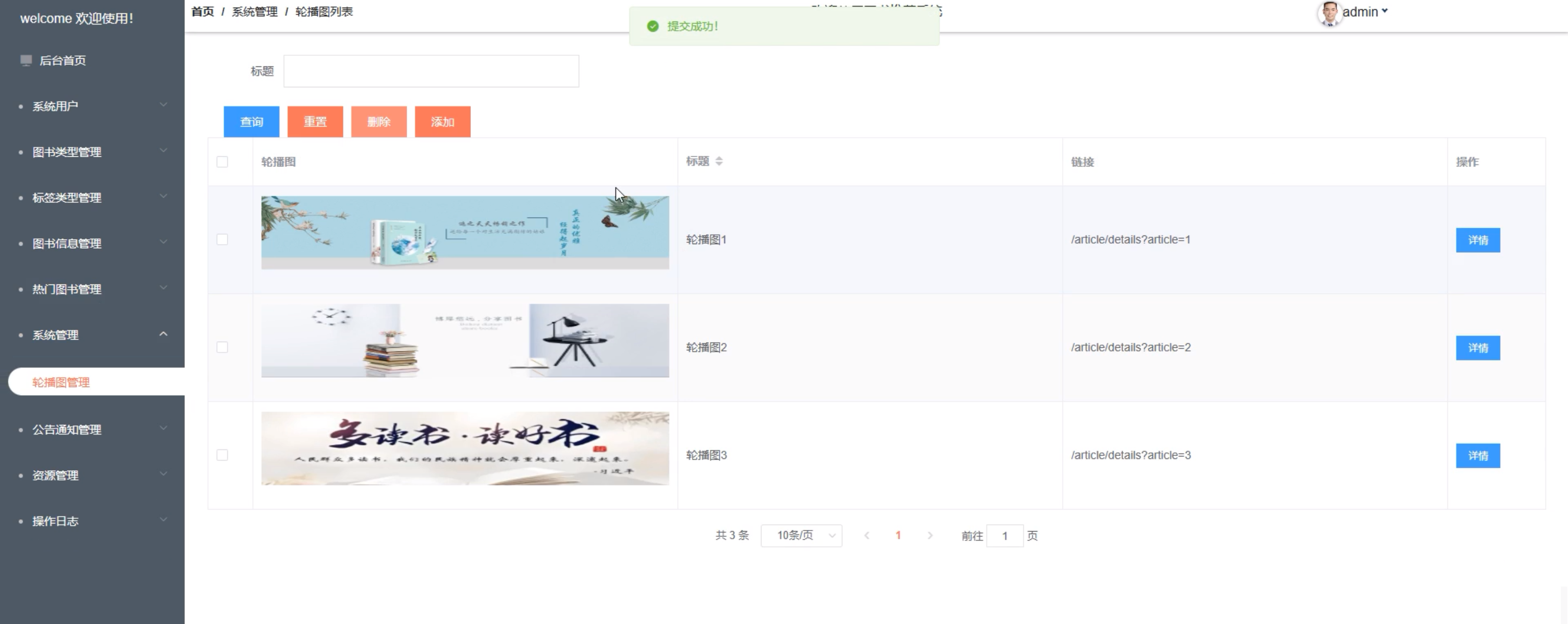 (7)系统管理:管理员点击可查看轮播图管理;如需添加新的轮播图,点击右侧“添加”按钮,上传图片,输入标题和链接,点击“确认”按钮进行添加,可对轮播图进行增删改查。