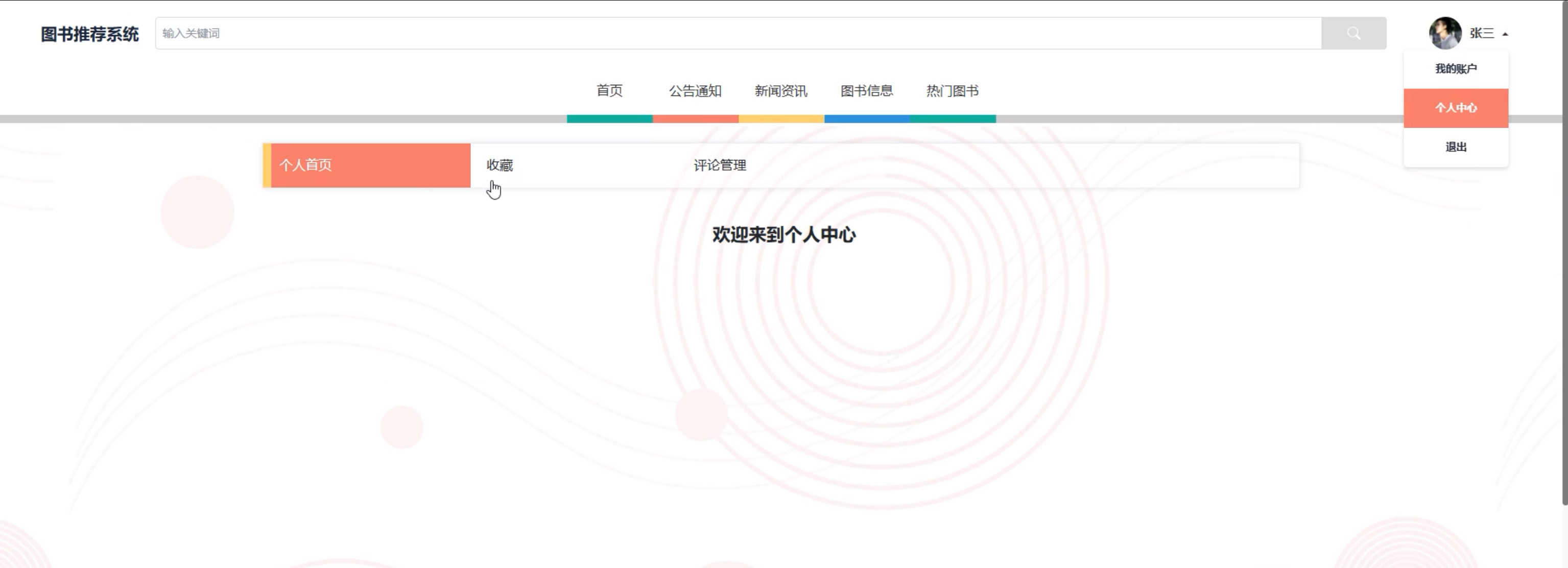 个人中心:个人中心包含多个功能模块,如个人首页、收藏和评论管理等内容,方便用户管理和查看自己的相关记录。界面如下图所示。