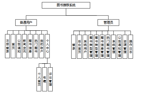 图书推荐系统包含普通用户和管理员两个角色划分,每个角色对应的主要功能如下: