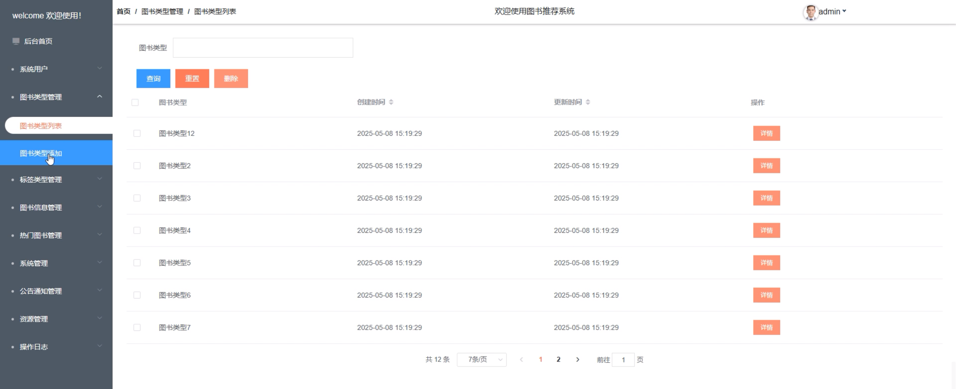 图书类型管理:管理员可通过“图书类型管理”功能轻松添加、编辑和删除图书类型。支持详细查询与操作,确保图书类型管理高效便捷。界面如下图所示。