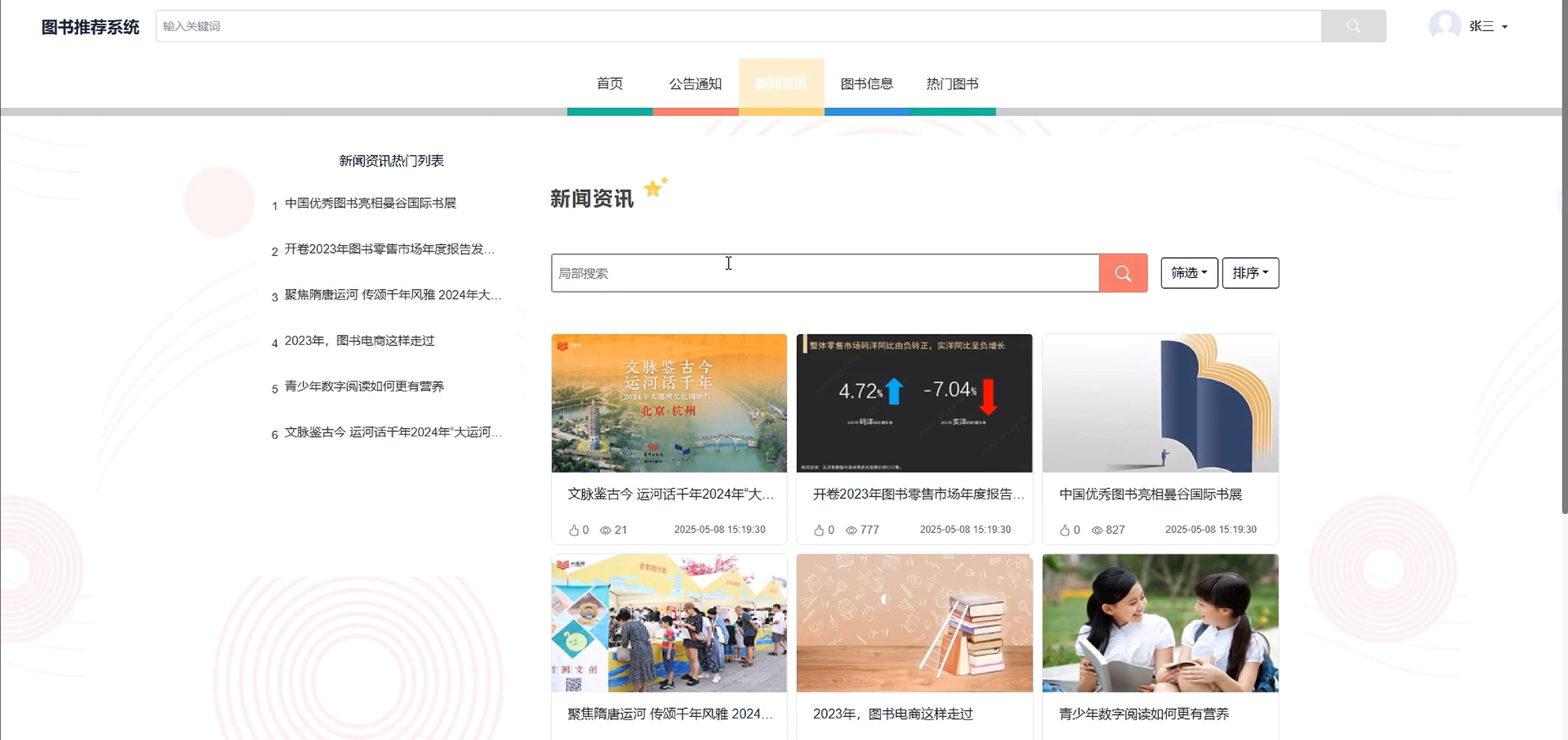 新闻资讯:新闻资讯功能模块提供最新的图书相关文章和信息,用户可以通过搜索、筛选和排序功能快速找到所需内容,同时可对资讯文章进行点赞、收藏和评论。界面如下图所示。
