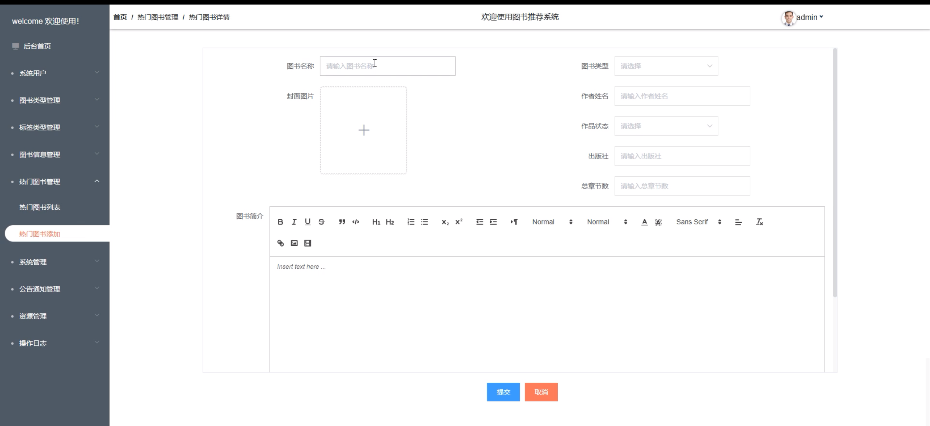 热门图书管理:管理员点击可查看热门图书列表和热门图书添加;点击进入“热门图书添加”可填写相关信息,包括图书名称、图书类型、封面图片、作者姓名、作品状态、出版社、总章节数和图书简介。界面如下图所示。