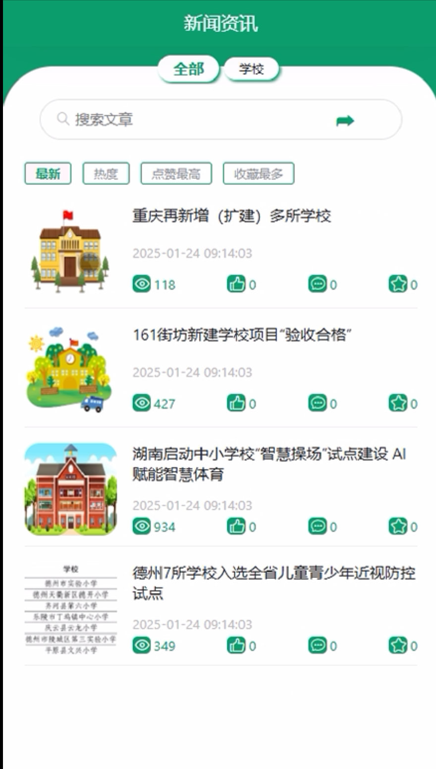 (4)校园资讯:用户点击可通过局部搜索进行浏览校园资讯,同时可对咨讯进行点赞、收藏和评论。