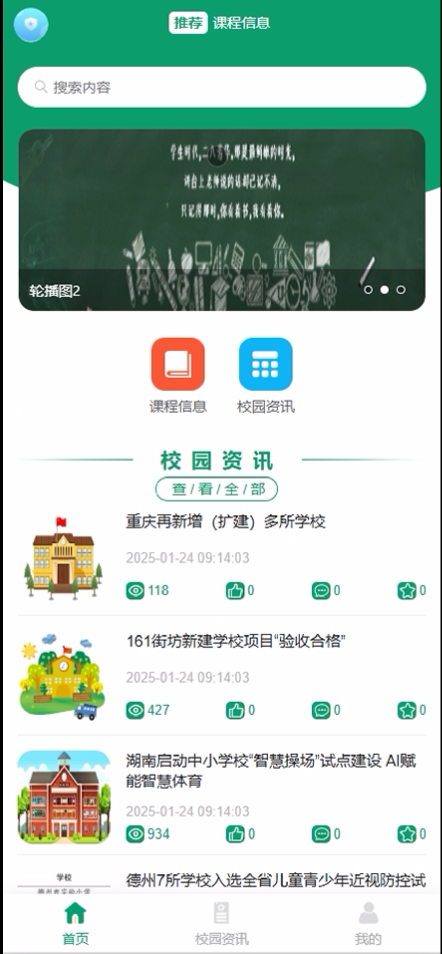 首页:当用户进入学生考勤管理系统的时候,首先映入眼帘的是系统的首页、课程信息、校园资讯和我的等信息。界面图如下。