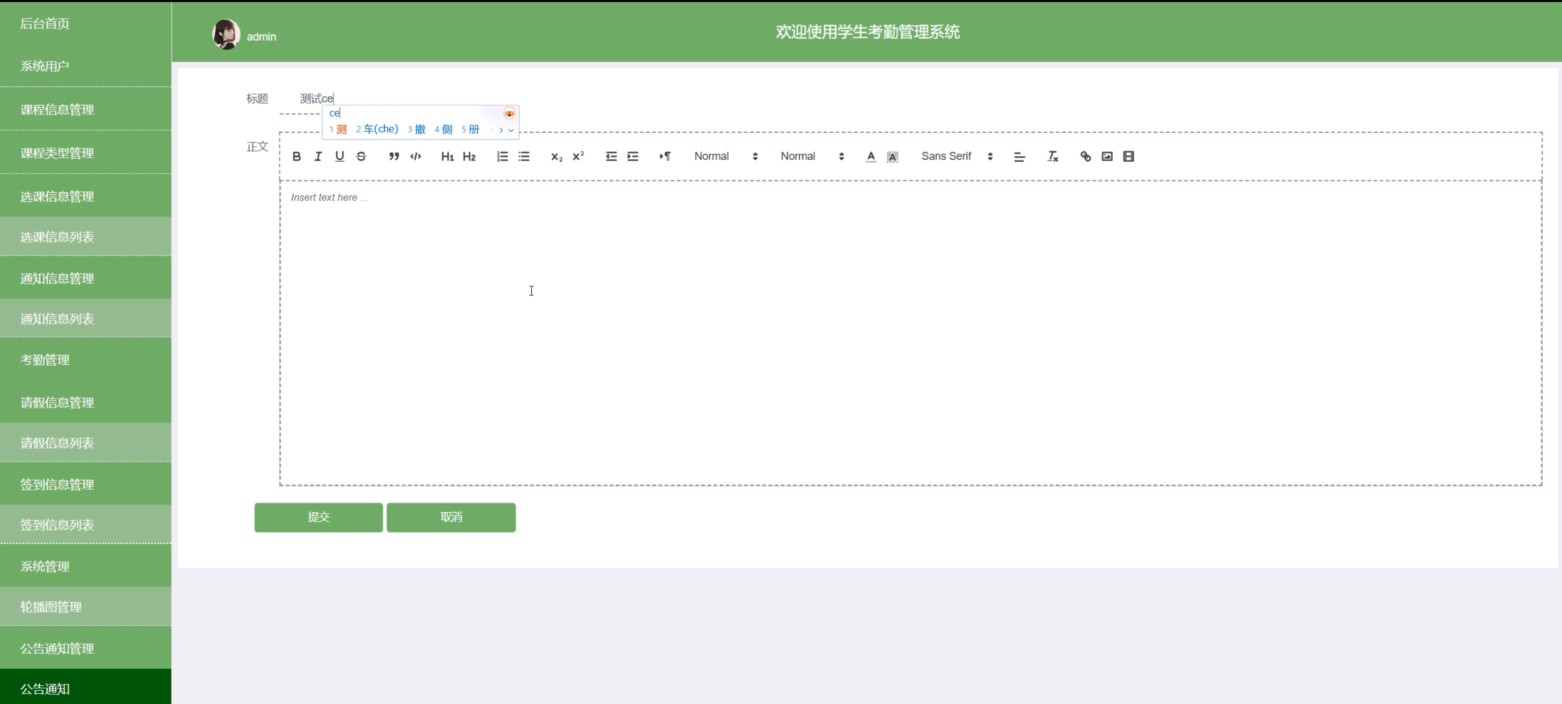 From the point of view of management, the system provides comprehensive support tools for teachers and administrators. Teacher users can manage course information, review students' application for course selection, and track and feedback students' attendance in real time through the system. The administrator has higher permissions and can manage system users, course information, course selection information, notices and announcements in a unified manner. At the same time, the administrator supports the maintenance of contents such as rotation map and campus information to ensure the richness and timeliness of the system content. In addition, the system also emphasizes the security and interactivity of data, and realizes the transparency and efficiency of attendance management through multi-level audit mechanism and real-time notification function. Overall, the system not only improves the work efficiency of college attendance management, but also provides a strong support for the information construction of teaching management.