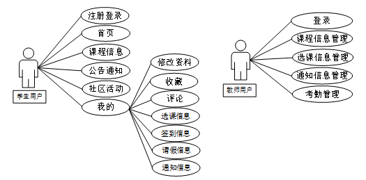 基于微信小程序学生考勤管理系统用户角色(学生用户、教师用户)用例图如图2.2所示: