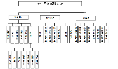 通过对基于微信小程序学生考勤管理系统的需求分析,该系统主要分为学生用户、教师用户和管理员三大功能模块。具体如下: