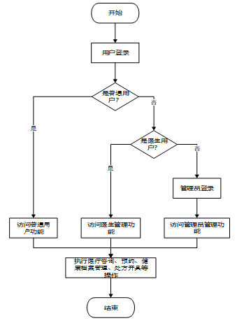 系统操作流程包括以下几个步骤:首先,用户(普通用户、医生、管理员)通过登录界面输入账号和密码进行身份验证。普通用户可进入个人主页,进行医生咨询、预约、健康档案录入等操作;医生则进行预约处理、就诊安排、处方开具、药品安排配送等;管理员可进行用户管理、所有功能模块维护管理等。管理员监控全平台运行,确保系统稳定、信息准确。
