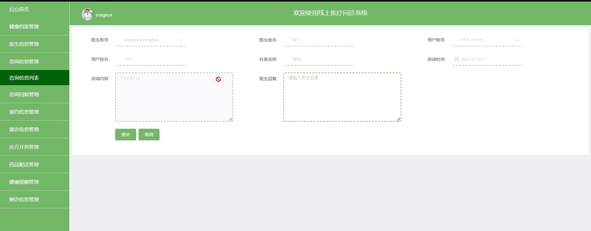 医生点击咨询信息功能后,可以查看用户提交的所有咨询内容,并对每一个问题进行详细回复。在回复界面中,医生可以提供专业的医疗建议,确保信息传达的准确性和全面性。