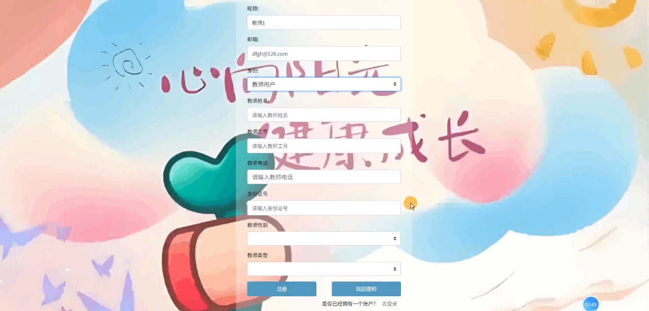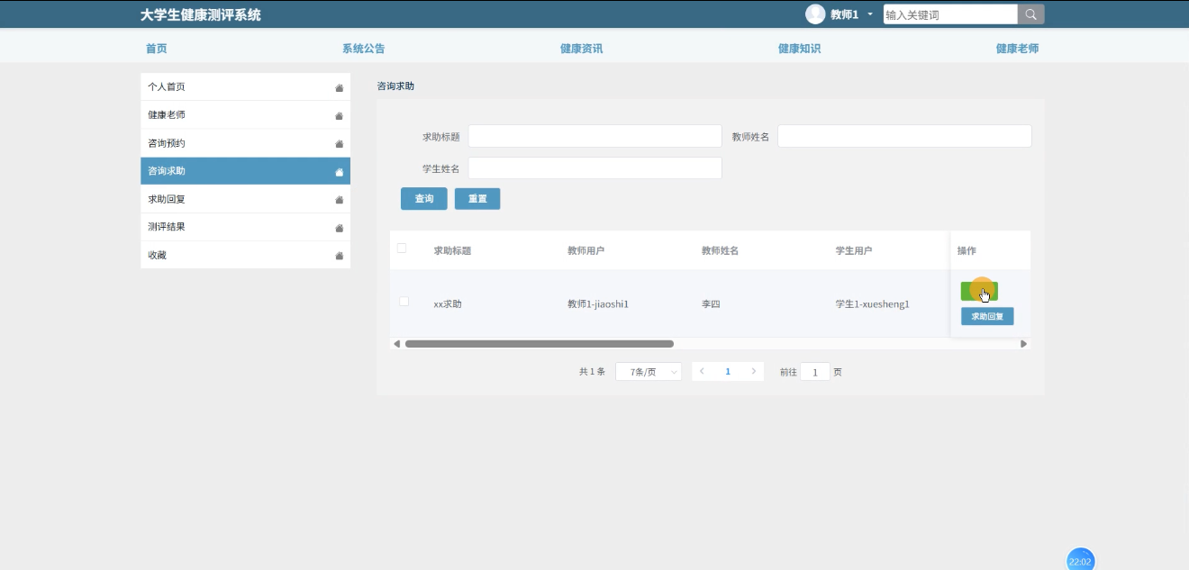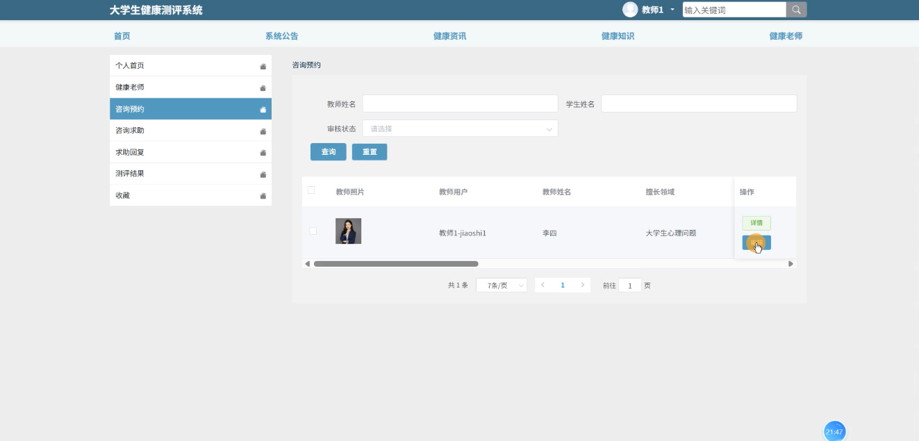 - 健康老师:学生用户可以查看健康老师列表,对感兴趣的老师信息可以点赞、收藏和评论,也可以预定这位老师的心理咨询,或者向健康老师进行求助。