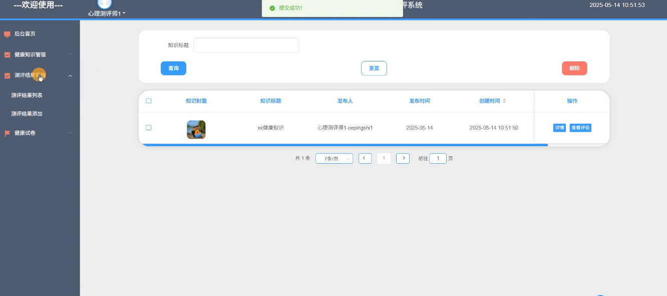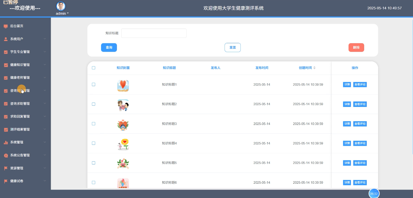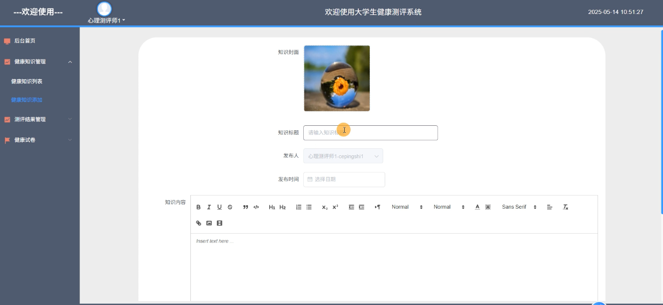 - 健康知识管理:心理测评师拥有查看、编辑健康知识列表的权限,也可以添加新的健康知识。