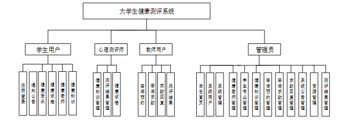 学生用户模块包含着公告通知、健康资讯、健康试卷、健康老师、健康知识等;教师用户包括咨询预约、咨询求助、求助回复、测评结果等模块;心理测评师包含健康知识管理、测评结果管理、健康试卷;管理员模块包括健康老师管理、学生专业管理、健康知识管理、咨询预约管理、咨询求助管理、求助回复管理、测评结果管理、资源管理、系统公告管理、系统管理等模块。