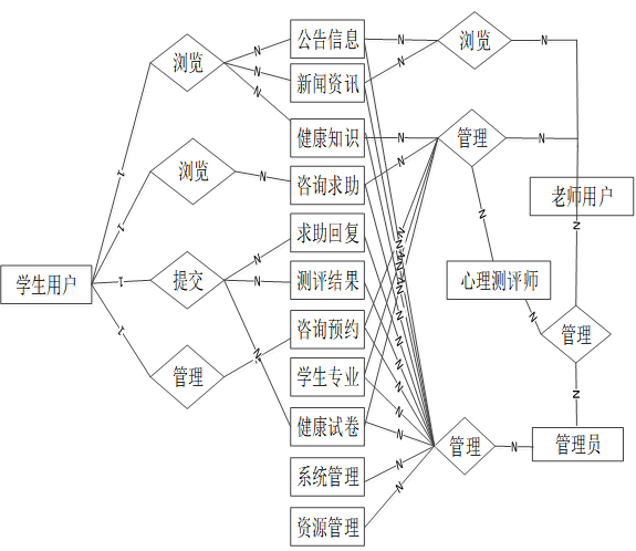 本系统从用户视角出发,深入探讨各项功能,并根据前后端分离的原则,明确划分了系统角色,包括管理员和学生用户、教师用户、心理测评师。