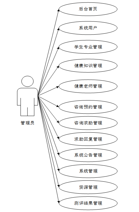 管理员在大学生健康测评系统中担任核心管理角色,拥有系统内的最高权限。其主要职责涉及信息的记录、通知发布以及系统后期的维护。管理员模块图如图2-1所示。