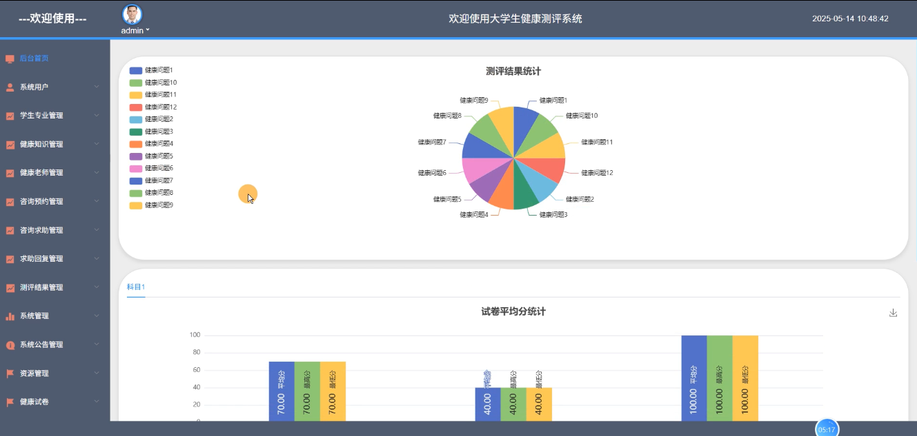 为提升大学生健康测评的科学性与效率,本文基于SpringBoot框架设计并实现了一套大学生健康测评系统。该系统采用B/S架构,以后端Java技术为核心,结合MySQL数据库,实现了用户管理、测评题库维护、在线测评、数据统计分析及结果反馈等核心功能。系统支持多角色权限管理,确保不同用户具备相应的操作权限,保障数据安全性与管理规范性。通过前后端分离的设计模式,提升了系统的可扩展性与可维护性,同时增强了用户体验。测试结果表明,系统运行稳定、响应高效,能够有效替代传统纸质测评方式,提高高校健康管理工作的信息化水平。本研究不仅为高校提供了一个实用的学生健康评估工具,也为后续智慧校园相关系统的建设提供了技术基础和实践参考。