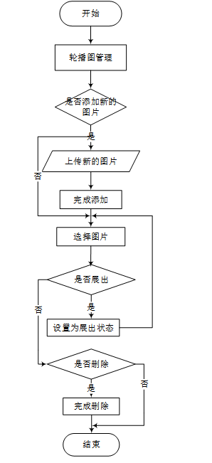 管理员的其他功能包括轮播图功能,允许管理员对系统平台的首页展示图片进行调整变换。或者展示暂时只展示部分特定图片进行宣传。失去时效性后的图片内容予以删除。系统管理流程图如图3-6所示。