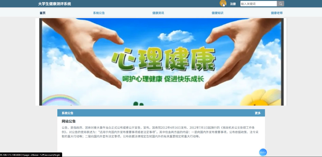 学生用户在首页能够轻松获取最新的公告通知、健康知识、健康老师等关键信息,及时把握网站的活动与最新动态。同时,首页还展示了热门及推荐的健康资讯内容,为学生用户提供了便捷的浏览体验。首页界面展示如图4-1所示。