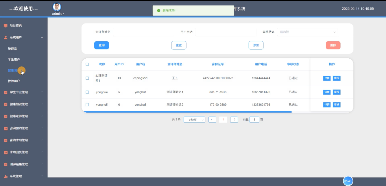 - 系统用户:为了确保管理的有序和高效,管理员集中管理包括学生及心理测评师用户在内的所有基础信息,确保信息的集中化和统一化管理。
