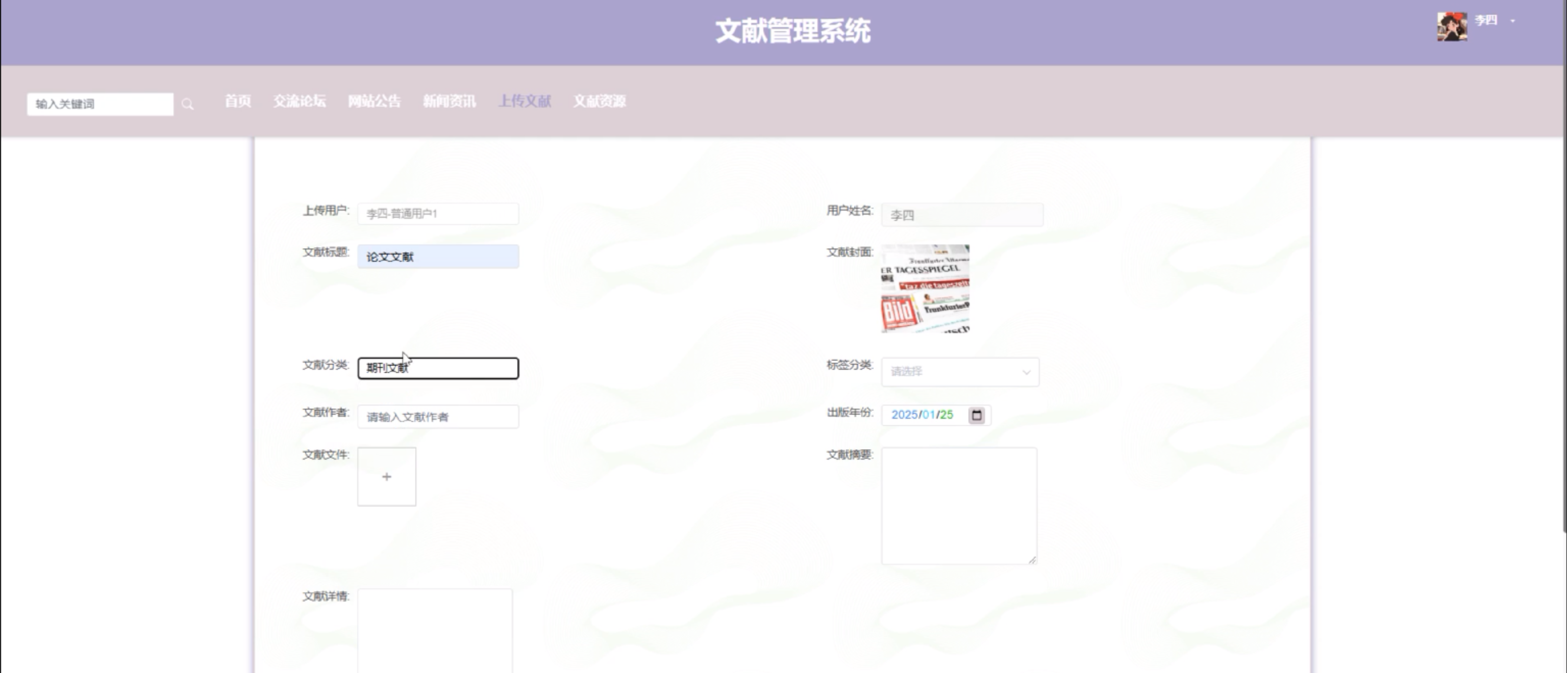 (6)上传文献:用户进入可进行上传文献操作,相关信息包括上传用户、用户姓名、文献标题、文献封面、文献分类、标签分类、文献作者、出版年份、文献文件、文献摘要和文献详情。