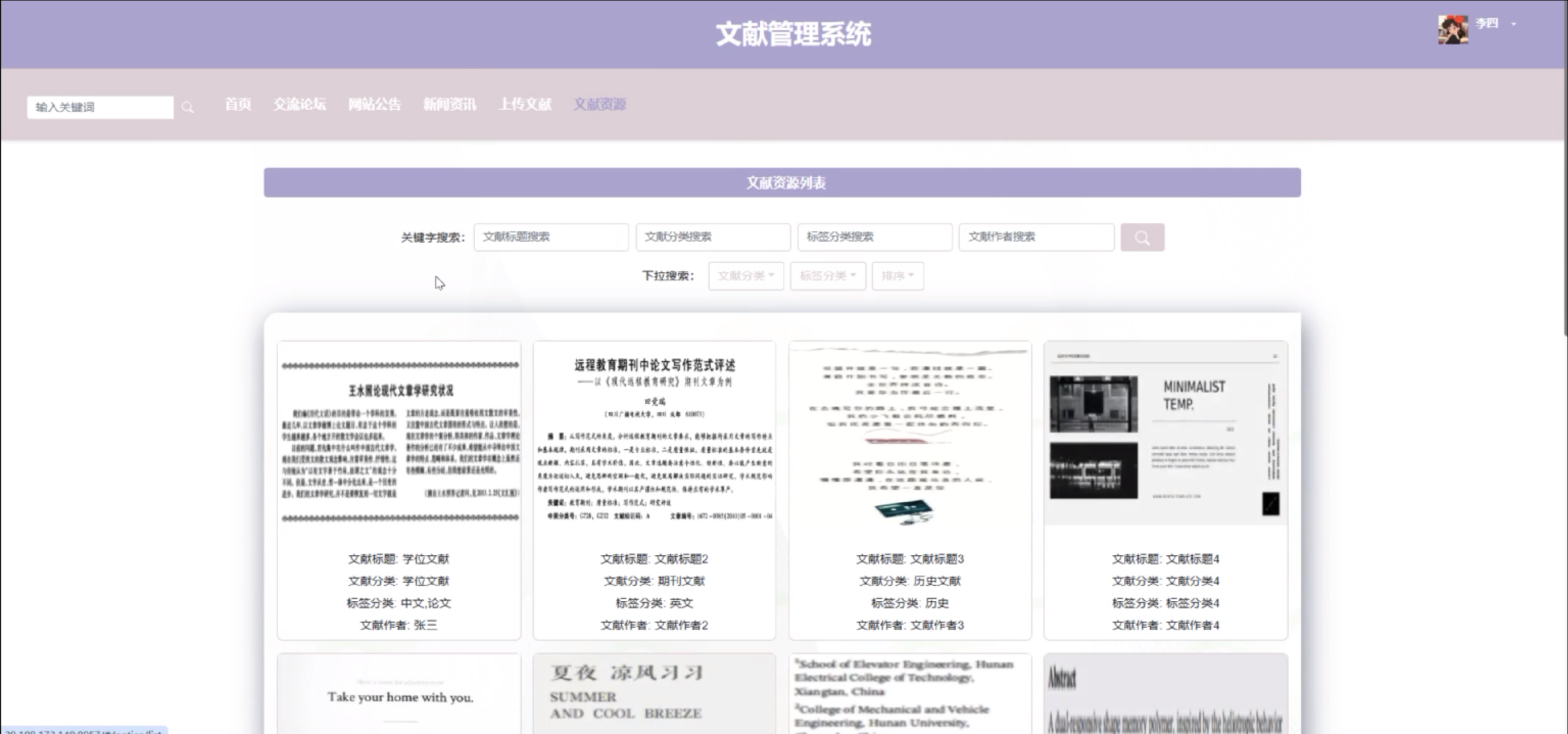 (7)文献资源:用户点击可通过搜索文献标题、文献分类和标签分类进行查看文献资源列表,可对文献资源进行点赞、收藏、评论和下载。