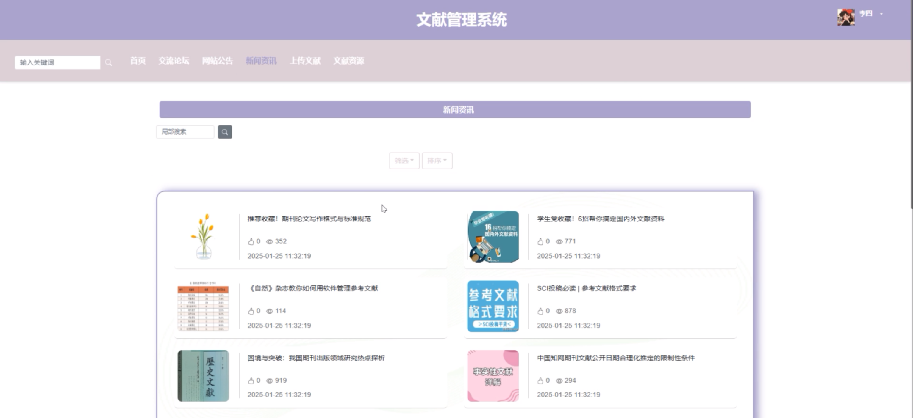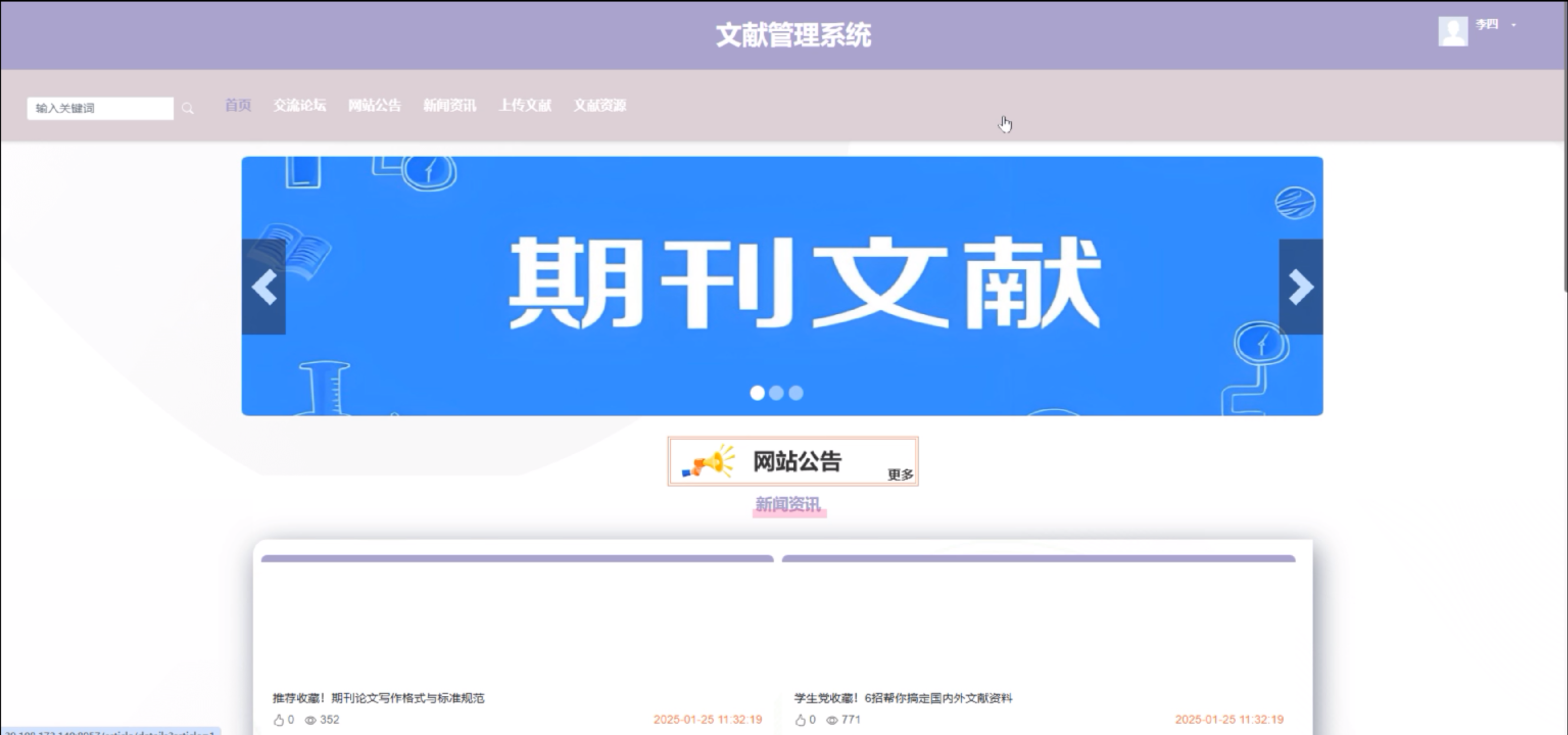 (2)首页:当用户进入文献管理系统的时候,首先映入眼帘的是系统的首页、甲流论坛、网站公告、新闻资讯、上传文献、文献资源等信息。