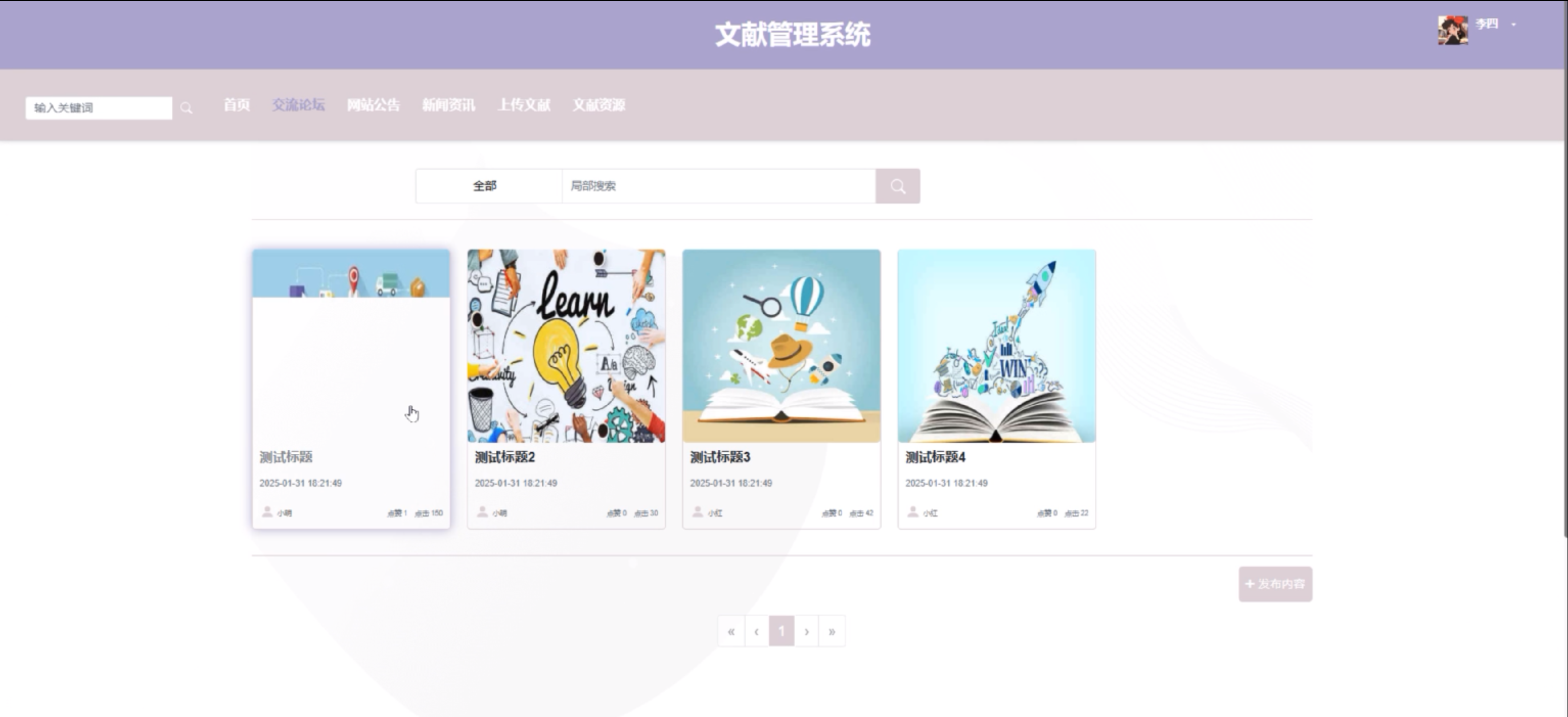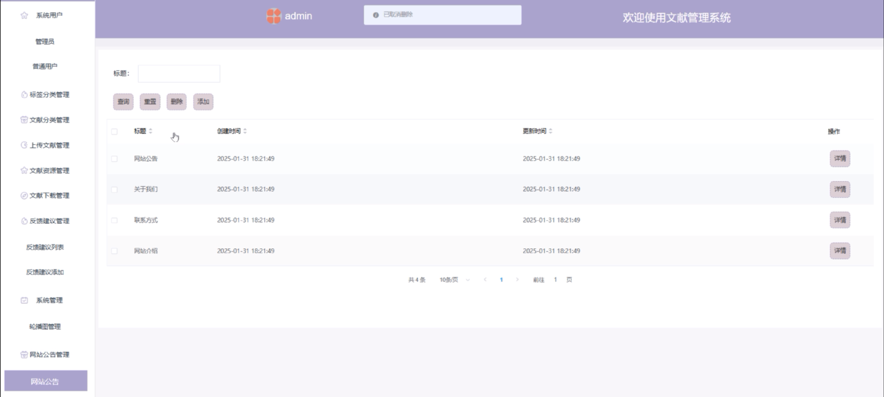 In the process of system design and implementation, the problems of complicated operation and isolated data in traditional document management system are solved. The administrator side provides powerful background management functions, including user management, label classification management, literature classification management and feedback and suggestion processing modules, making the system has a high degree of flexibility and scalability. In addition, the system also introduces the function of rotation chart management and announcement release, which further improves the effect of information display. On the whole, the document management system not only provides users with a convenient platform for obtaining document resources, but also provides administrators with a set of efficient management tools, reflecting the deep integration of technology and practical needs.