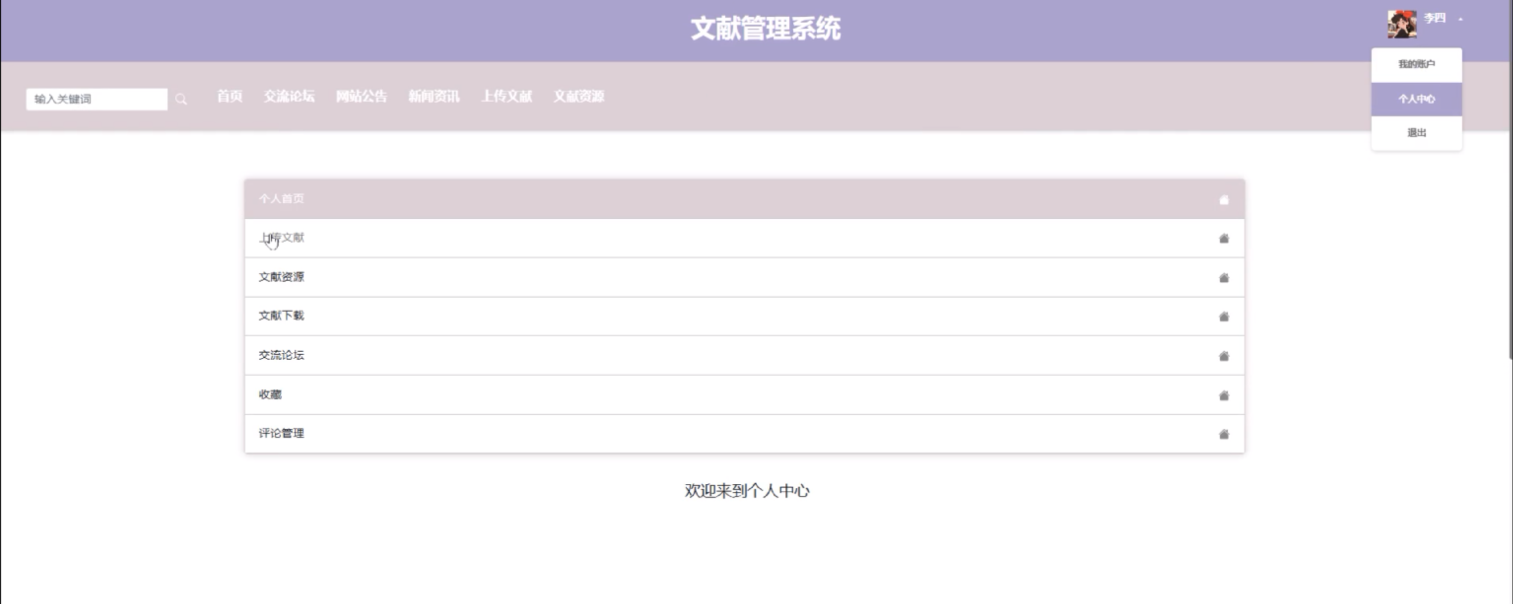 (9)个人中心:个人中心包含多个功能模块,如个人首页、上传文献、文献资源、文献下载、反馈建议、交流论坛、收藏和评论管理。点击进入“上传文献”可查看上传记录,同时可点击“储存文件”,储存后就会在前台文献资源处展示,可以给其他用户进行下载;点击进入“反馈建议”可填写相关信息,包括反馈标题、反馈日期、反馈截图和反馈详情。同时可点击其他功能模块进行查看和管理。