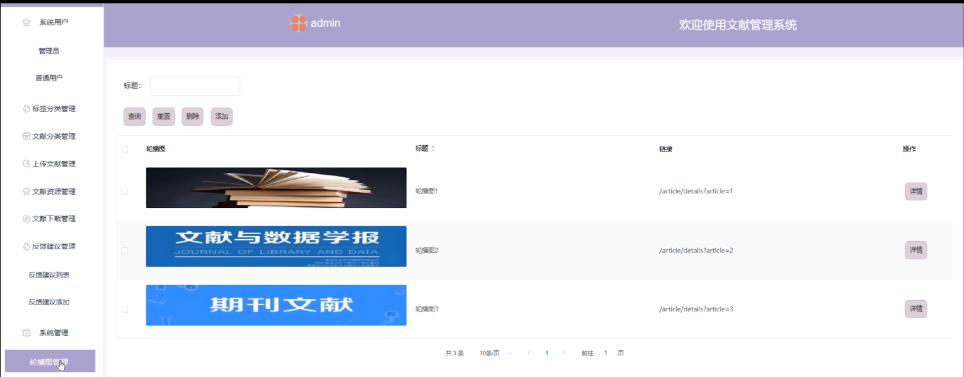 (9)系统管理:管理员点击可查看轮播图管理;如需添加新的轮播图,点击右侧“添加”按钮,上传图片,输入标题和链接,点击“确认”按钮进行添加;同时可对轮播图进行增删改查。