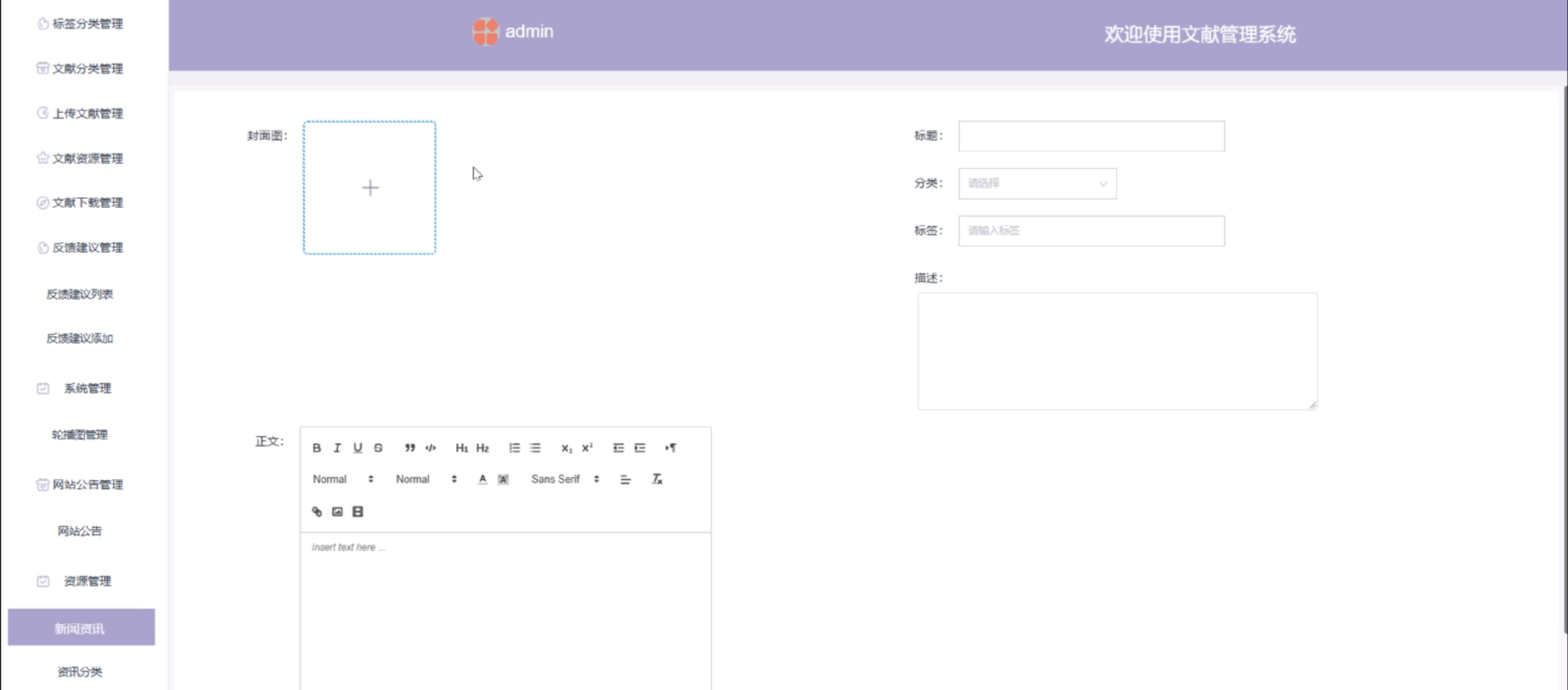 资源管理:管理员点击可查看新闻咨讯和咨讯分类;如需添加新的资讯,点击“添加”按钮,上传封面图,输入标题,选择分类,输入标签、描述和正文,点击“确认”按钮进行添加。同时可对咨讯和分类进行增删改查。界面如下图所示。