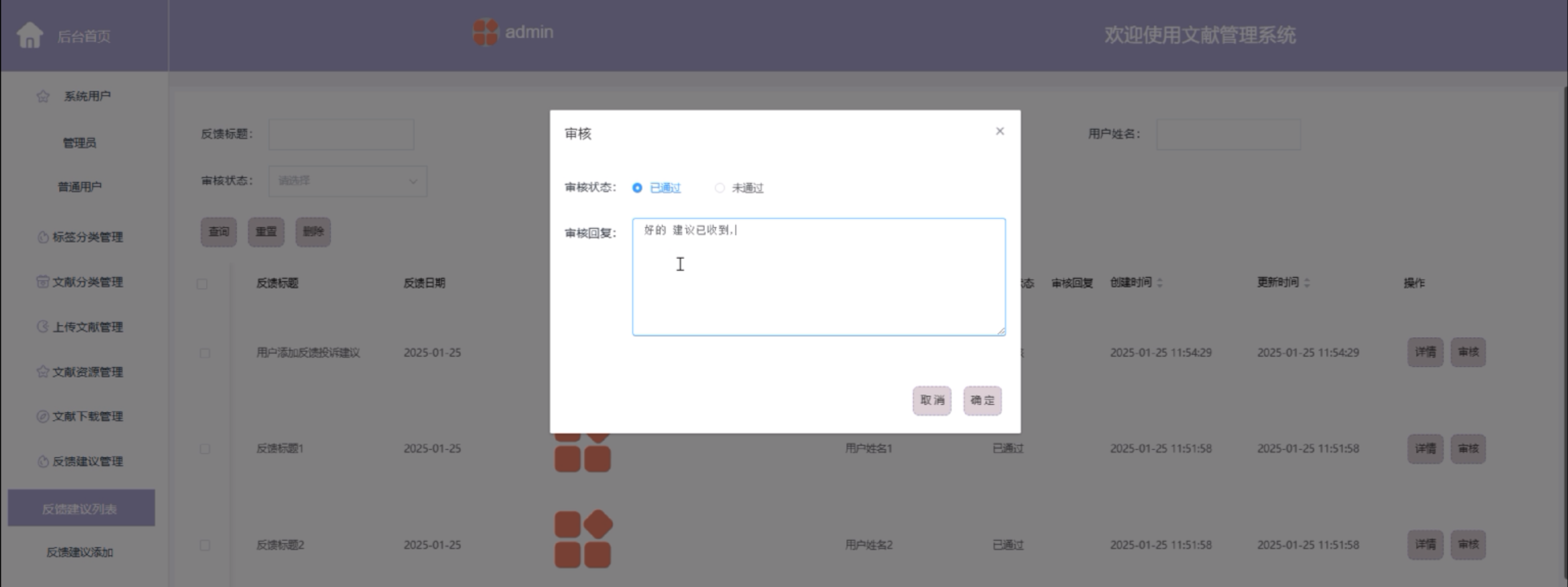 (8)反馈建议管理:管理员点击可查看反馈建议列表,同时可对用户的反馈意见进行审核回复。
