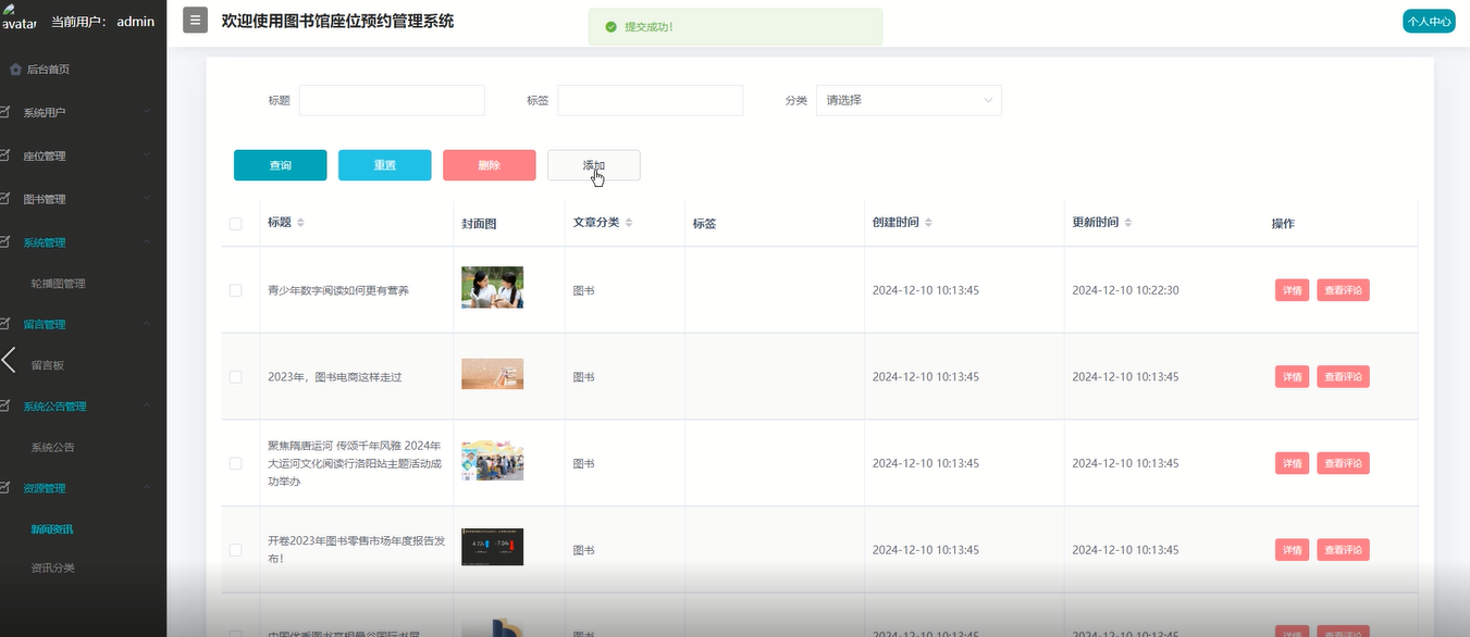 5.座位预约管理:管理员可以查看和处理用户的座位预约请求,确保预约系统的正常运行。