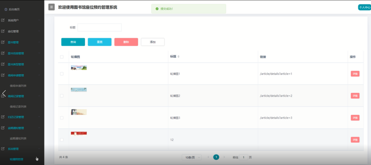 系统管理:当管理员点击“系统管理”时,可查看轮播图管理; 如需添加新的轮播图,点击右侧“添加”按钮,上传图片,输入标题,点击“确认”按钮进行添加;同时可对轮播图进行增删改查。界面如下图所示。