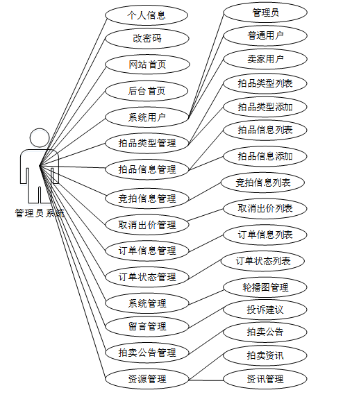 基于Java的在线拍卖系统的设计与实现中管理员包含个人信息、改密码、网站首页、后台首页、系统用户、拍品类型管理、拍品信息管理、竞拍信息管理、取消出价管理、订单信息管理、订单状态管理、系统管理、留言管理、拍卖公告管理、资源管理等功能。管理员用例图如下所示: